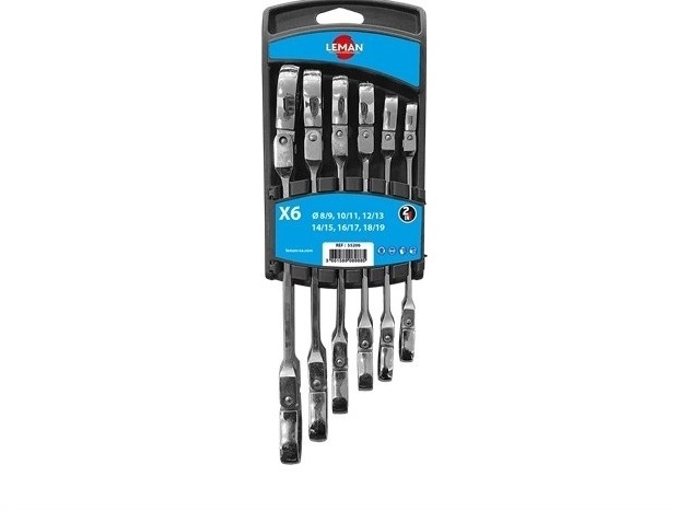 2 størrelser per skiftenøkkel. 72 tenner skralle, 5 ° utvinningsvinkel. 180° fleksibelt skrallehode, ideelt for bruk på trange og trange steder. Endring av rotasjonsretning ved å snu skiftenøkkelen. Krom Vanadium stål. 6 skiftenøkler: 8*9 / 10*11 / 12*13 / 14*15 / 16*17 / 18*19.